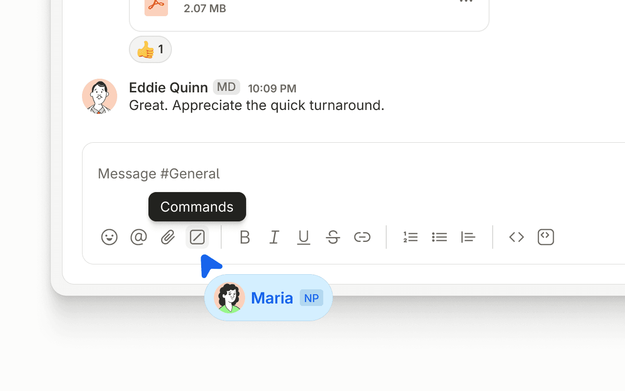 Once an app is enabled, you can access it directly from the message bar. Type "/" or select the slash icon in the bottom bar to open the app launcher and choose from your available integrations.